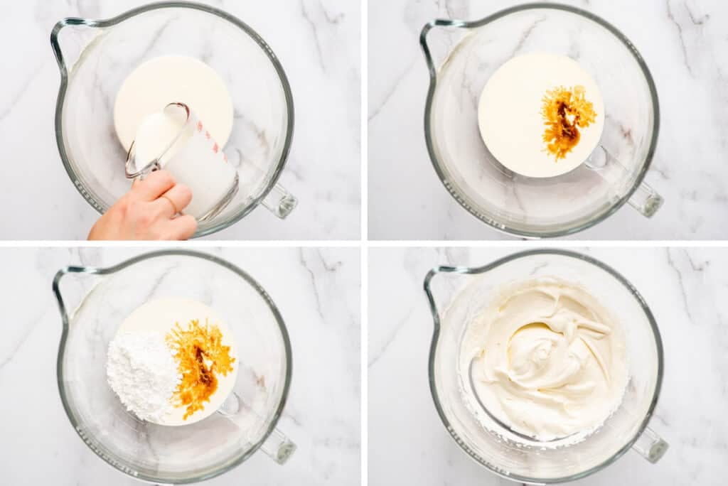 - Cream cheese whipped cream: Use 4 ounces of cream cheese. Beat the sugar and vanilla into softened cream cheese until well-mixed. In a separate bowl, whip heavy cream into stiff peaks and then fold the whipped cream into the cream cheese mixture until uniform in color.